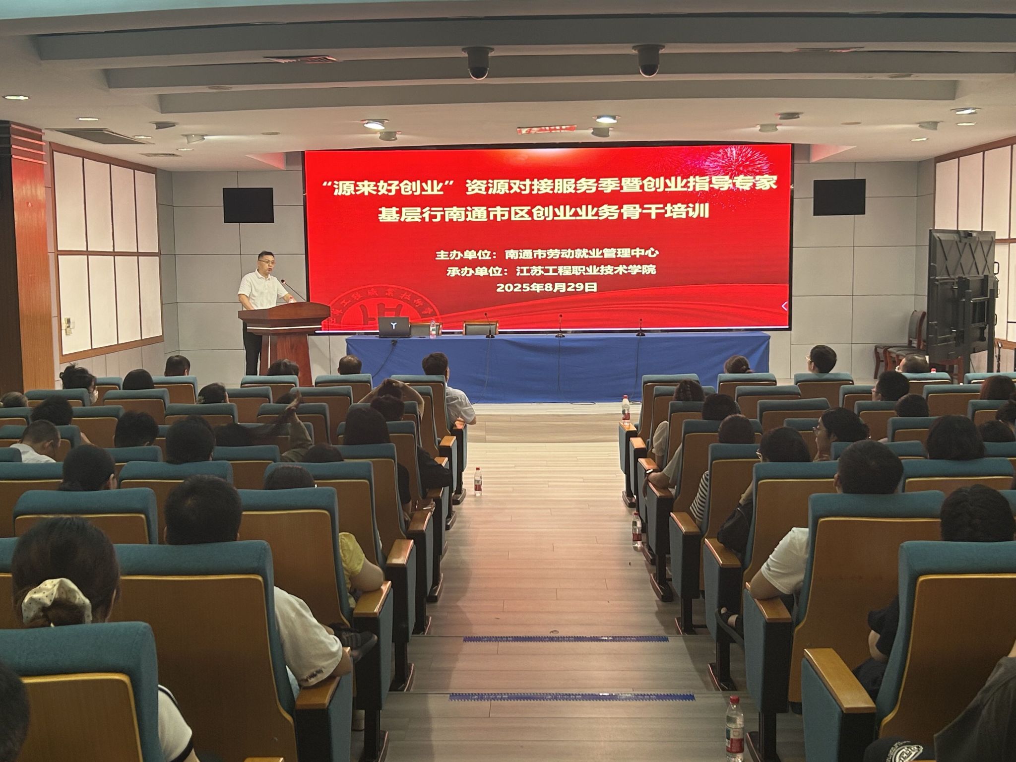 8 月 29 日下午,由我校承办的 “源来好创业” 资源对接服务季暨省级创业指导专家基层行南通市区创业业务骨干培训班,在强毅楼 12 楼演播厅顺利开班。来自崇川区、开发区分管创业工作的领导、街道创业工作业务骨干、社区业务骨干代表、市区创业孵化基地政策专员,以及我校部分创业培训指导教师,共 70 余人参加了本次培训。南通市劳动就业管理中心副主任丁小龙、培训科科长王蓓等出席了开班仪式。我校继续教育学院院长江荣华致欢迎辞,并介绍了我校一贯重视创业培训工作,始终依托学校专业优势与校企合作资源,积极搭建创业培训、项目孵化平台,在培养技能型创业人才、助力地方创业生态建设中持续发力。