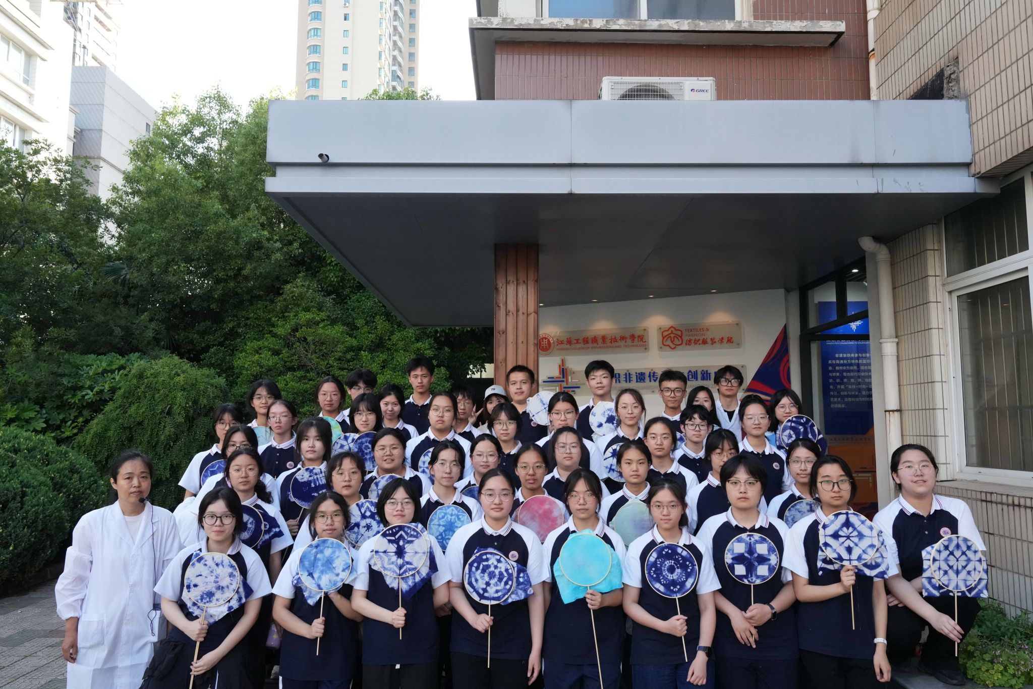 5月21日,纺织服装学院联合南通市第一中学开展非遗扎染职业体验活动。近百名高二学子在染织非遗传承与创新中心教师的专业指导下,通过亲手制作“圆满扎染团扇”和“旗开得胜扎染书签”,沉浸式感受传统技艺魅力,开启职业生涯启蒙第一课。